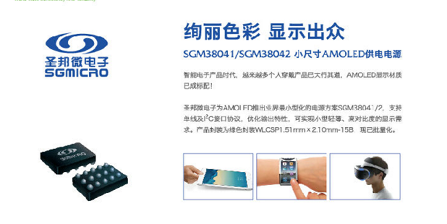 圣邦微电子(北京)股份有限公司(SG Micro Corp)(以下简称“圣邦股份”)是一家专注于高性能、高品质模拟集成电路研发和销售的半导体公司。圣邦股份的通用模拟IC产品性能优良、品质卓越,可广泛应用于智能手机、PAD、数字电视、DVD、数码相机、笔记本电脑、可穿戴式设备、各种消费类电子产品以及车载电子、工业控制、医疗设备、测试仪表等众多领域。小尺寸AMOLED供电电源圣邦微电子为AMOLED推出业界最小型化的电源方案SGM38041/2,支持单线及I2C接口协议,优化输出特性,可实现小型轻薄、高对比度的显示需求。